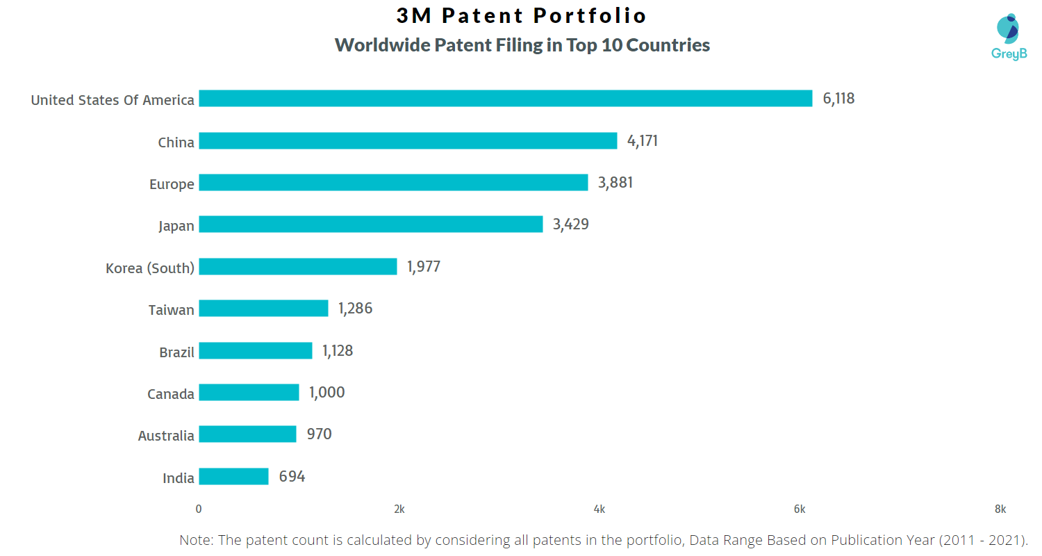 3M has a total of 69622 patents globally, out of which 36373 have been granted. Of these 69622 patents, more than 43% patents are active. United States of America is where 3M has filed the maximum number of patents, followed by Europe and China and it also seems reasonable as the biggest market for 3M is USA. Parallelly, USA seems to be the main focused R&D center and is also the origin country of 3M.