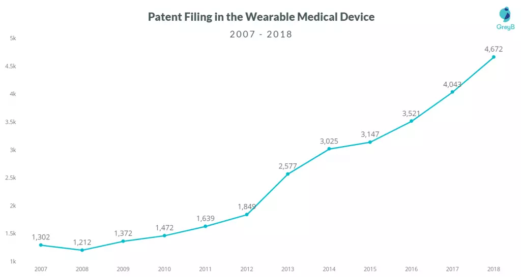 The wearable medical device market is estimated to grow at a CAGR of 20.5% between 2020 and 2025 and is forecasted to touch $46.6 billion. The number of patents filed per year in 2018 has grown by 350% to the number of patents filed in 2007. The year-wise patent filing trend of Wearable Medical Device is below: