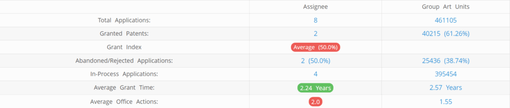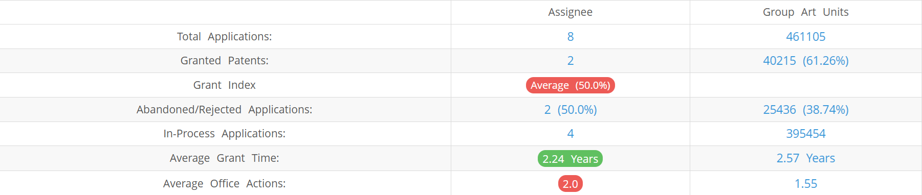 AcuraStem (Excluding its subsidiaries) has filed 8 patent applications at USPTO so far (Excluding Design and PCT applications). Out of these 2 have been granted leading to a grant rate of 50.0%.