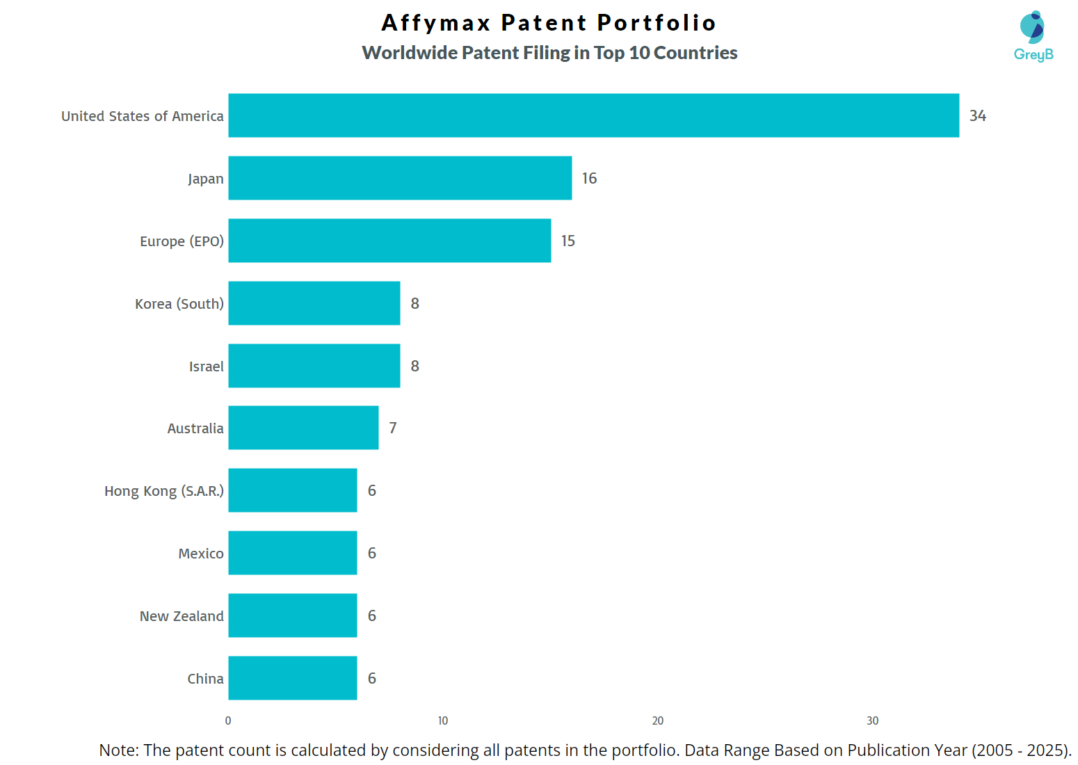 Affymax has a total of 213 patents globally, out of which 107 have been granted. Of these 213 patents, 2% patents are active. The United States of America is where Affymax has filed the maximum number of patents, followed by Japan and Europe (EPO). Parallelly, United States of America seems to be the main focused R&D centre and also is the origin country of Affymax.