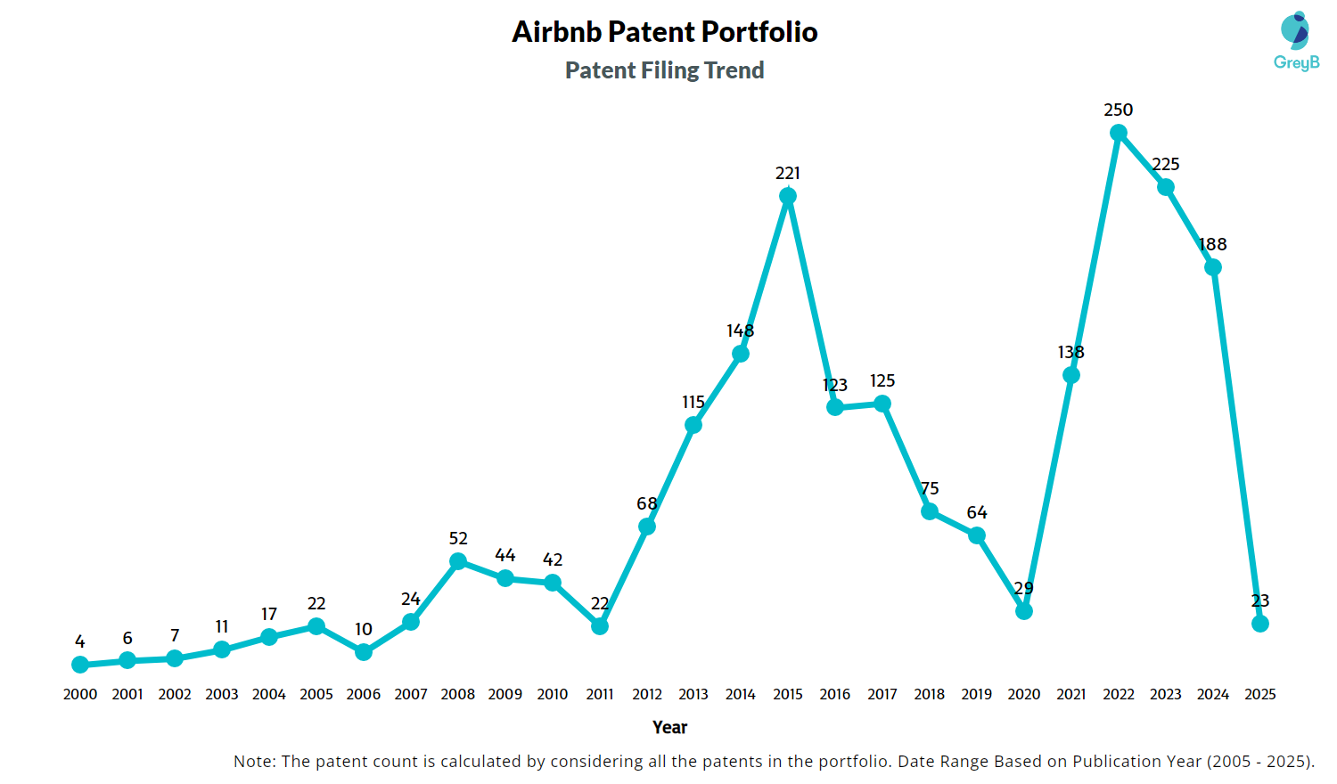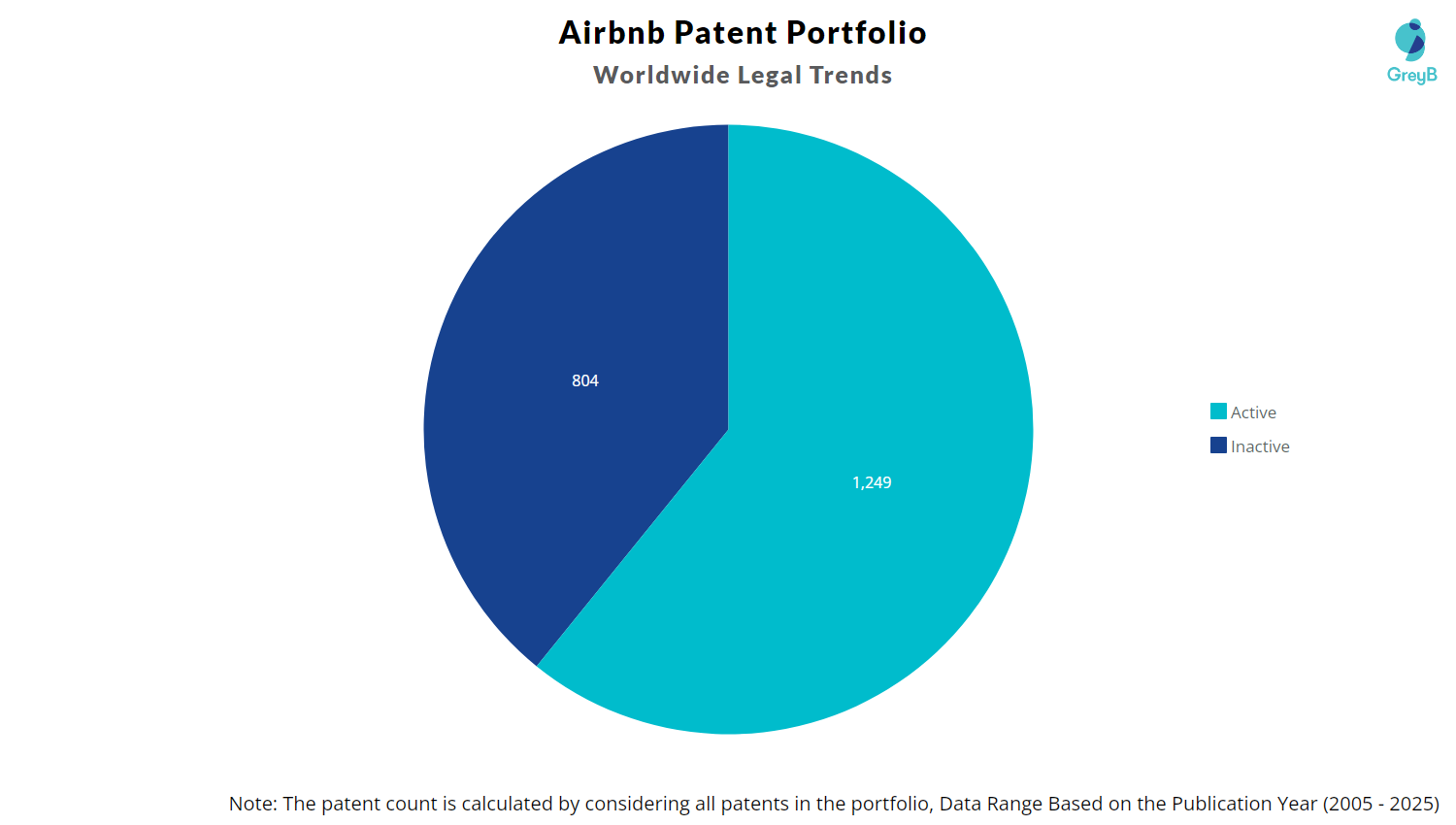 Airbnb has a total of 2053 patents globally. These patents belong to 836 unique patent families. Out of 2053 patents, 1249 patents are active.
