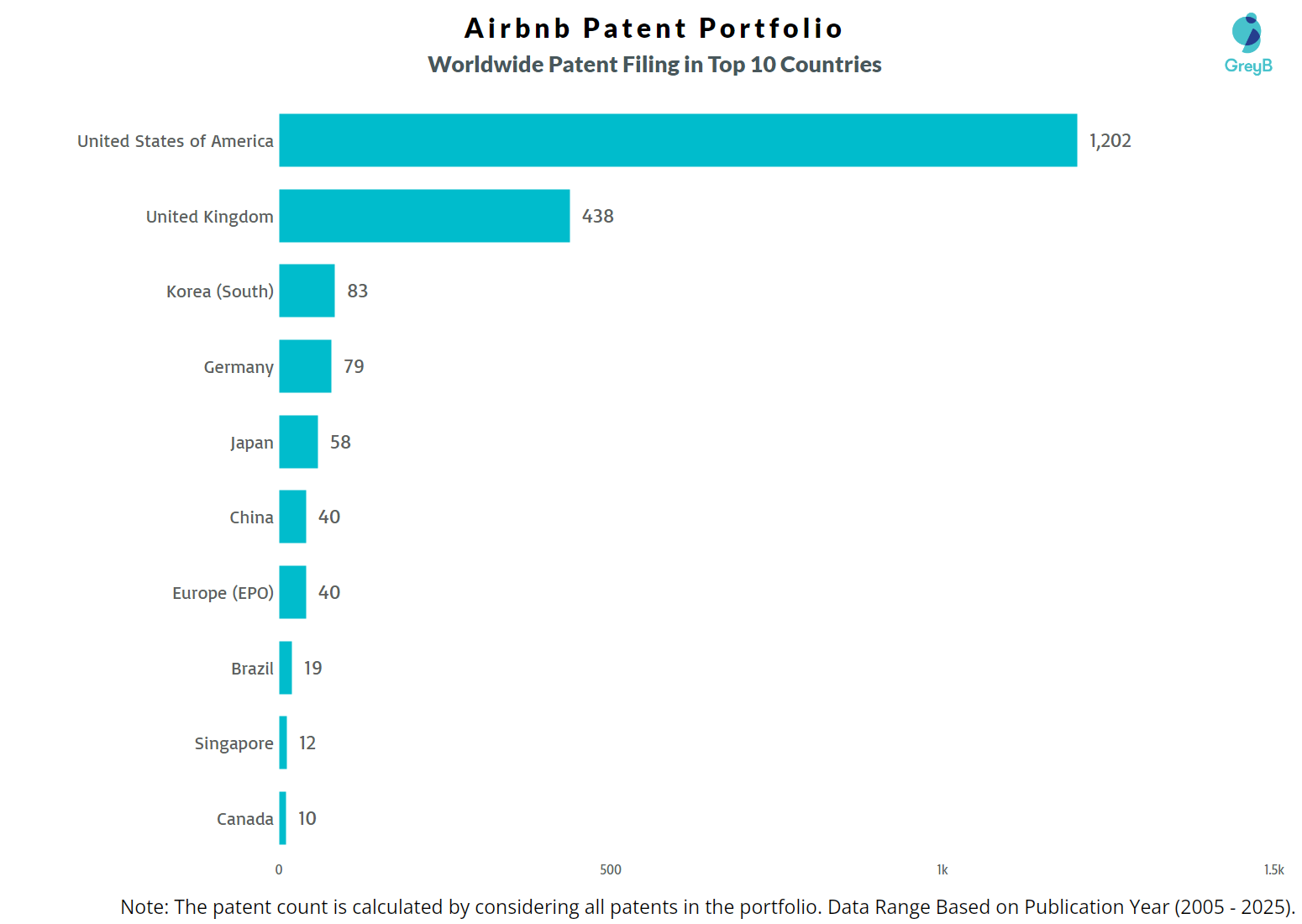 Airbnb has a total of 2053 patents globally, out of which 1841 have been granted. Of these 2053 patents, more than 61% patents are active. United States of America is where Airbnb has filed the maximum number of patents, followed by United Kingdom and South Korea. Parallelly, United States of America seems to be the main focused R&D centre and also is the origin country of Airbnb.