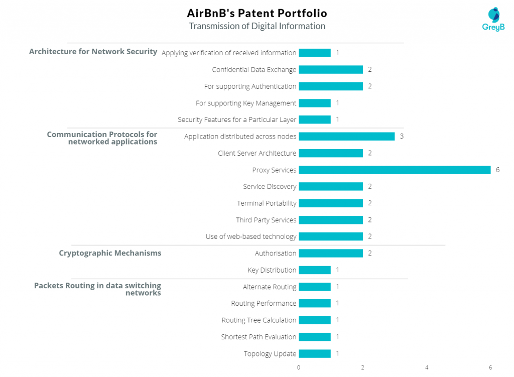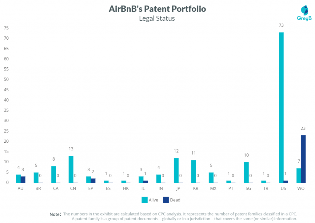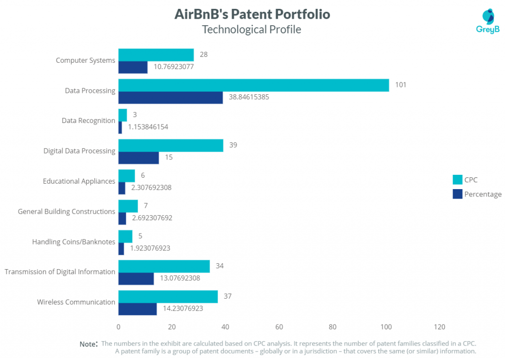 The chart below distributes patents filed by Airbnb in different countries on the basis of the technology protected in patents. It also represents the markets where Airbnb thinks it’s important to protect particular technology inventions.