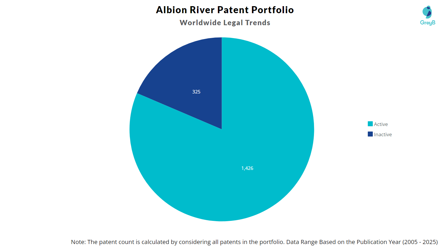 Albion River has a total of 1751 patents globally. These patents belong to 440 unique patent families. Out of 1751 patents, 1426 patents are active.