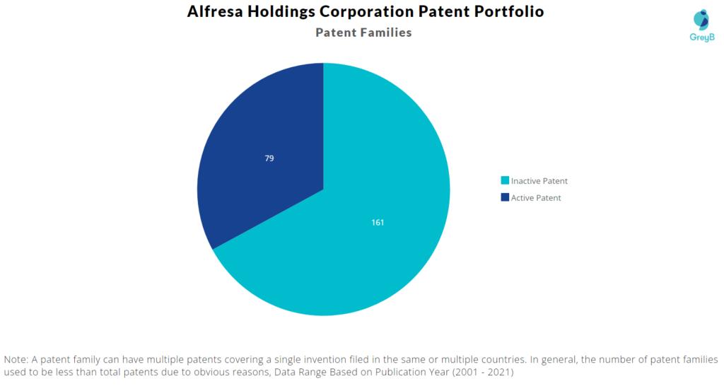 Alfresa Holdings Corporation has a total of 434 patents globally. These patents belong to 240 unique patent families. Out of 434 patents, 158 patents are active.