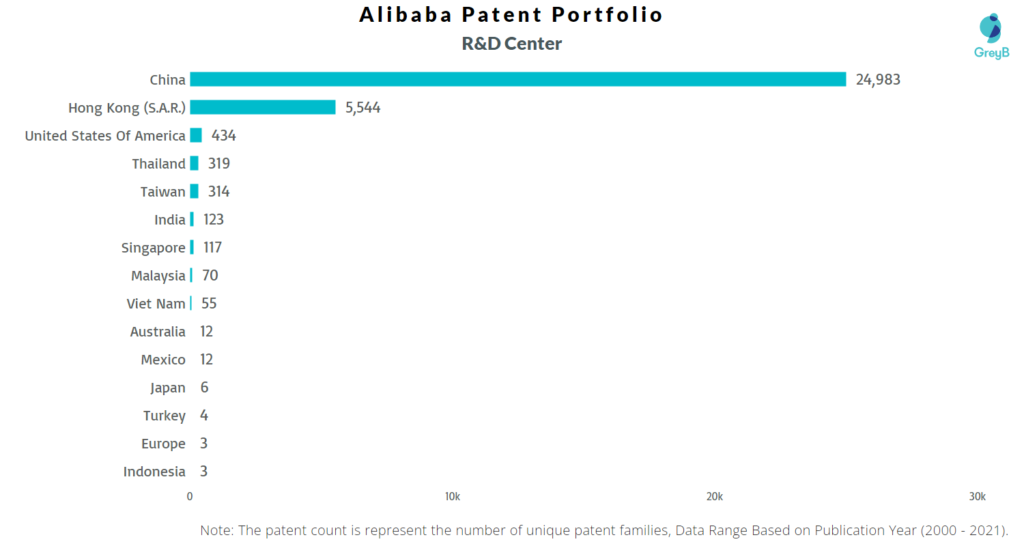 Alibaba has a total of 68384 patents globally, out of which 8175 have been granted. Of these 68384 patents, more than 75% patents are active. China is where Alibaba has filed the maximum number of patents, followed by Hong Kong (S.A.R.) and United States of America. Parallelly, China seems to be the main focused R&D centre and also is the origin country of Alibaba.
