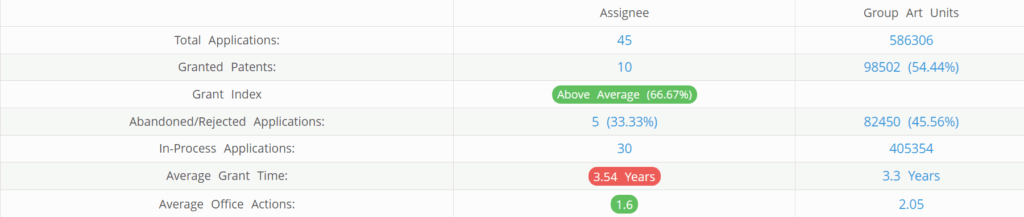 Allogene Therapeutics (Excluding its subsidiaries) has filed 45 patent applications at USPTO so far (Excluding Design and PCT applications). Out of these 10 have been granted leading to a grant rate of 66.67%.