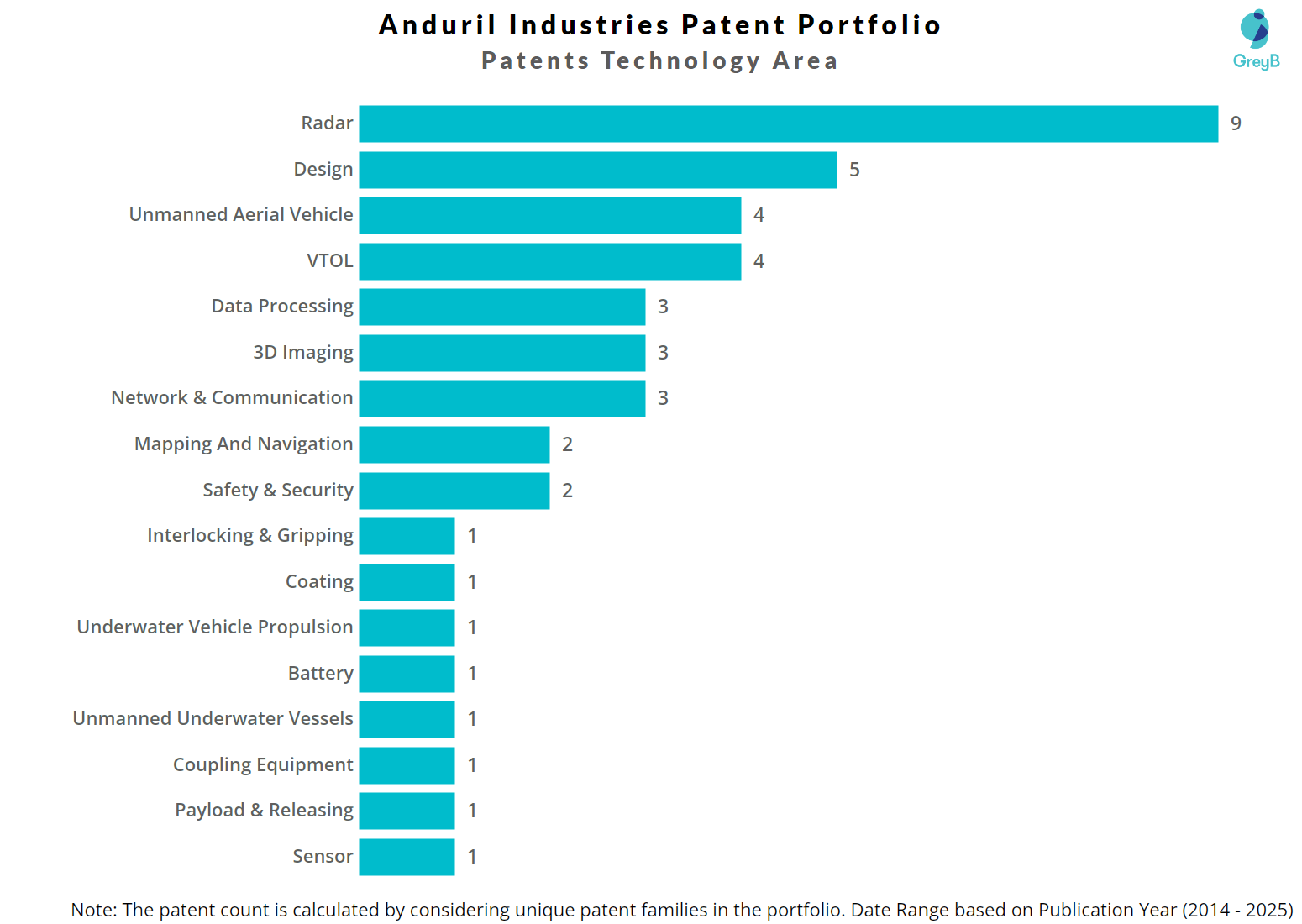The chart below distributes patents filed by Anduril Industries in different countries on the basis of the technology protected in patents. It also represents the markets where Anduril Industries thinks it’s important to protect particular technology inventions.