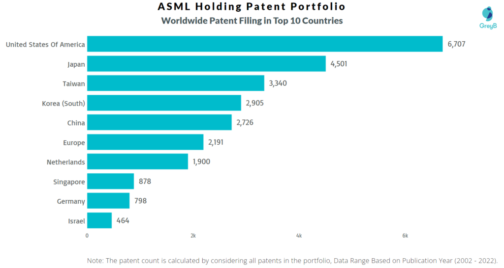 ASML Holding has a total of 33311 patents globally, out of which 19791 have been granted. Of these 33311 patents, more than 50% patents are active. The United States of America is where ASML Holding has filed the maximum number of patents, followed by Japan and Taiwan. Parallelly, United States of America seems to be the main focused R&D center and also is the origin country of ASML Holding.