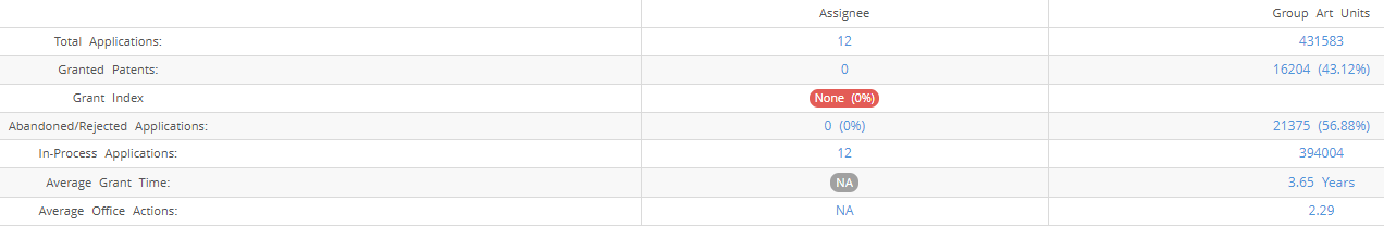 Ava Food Labs (Excluding its subsidiaries) has filed 12 patent applications at USPTO so far (Excluding Design and PCT applications). Out of these none have been granted leading to a grant rate of 0%.