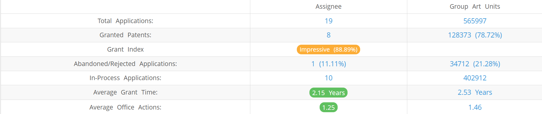 Avidbots (Excluding its subsidiaries) has filed 19 patent applications at USPTO so far (Excluding Design and PCT applications). Out of these 8 have been granted leading to a grant rate of 88.89%.