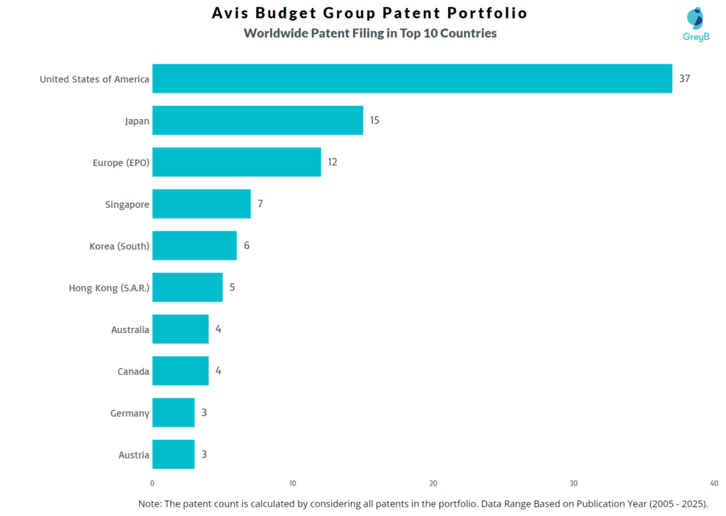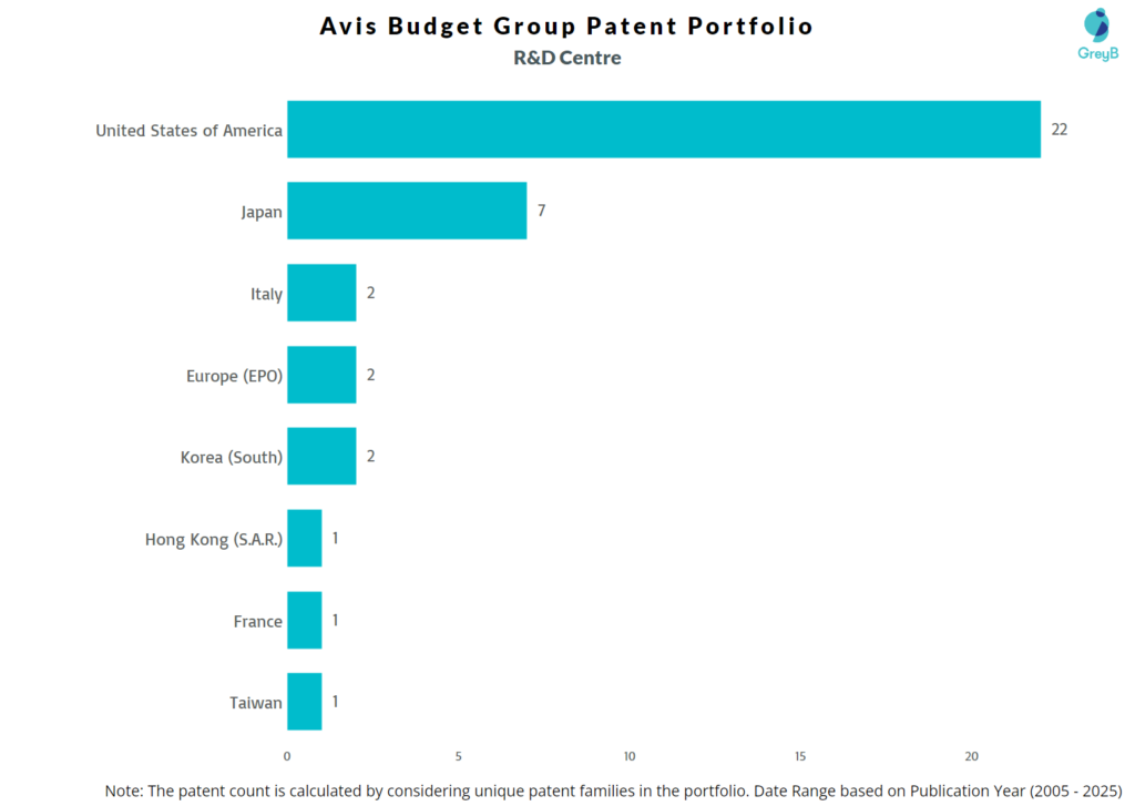 Avis Budget Group has a total of 134 patents globally, out of which 53 have been granted. Of these 134 patents, more than 34% patents are active. United States of America is where Avis Budget Group has filed the maximum number of patents, followed by Japan and Europe (EPO). Parallelly, United States of America seems to be the main focused R&D centre and also is the origin country of Avis Budget Group.
