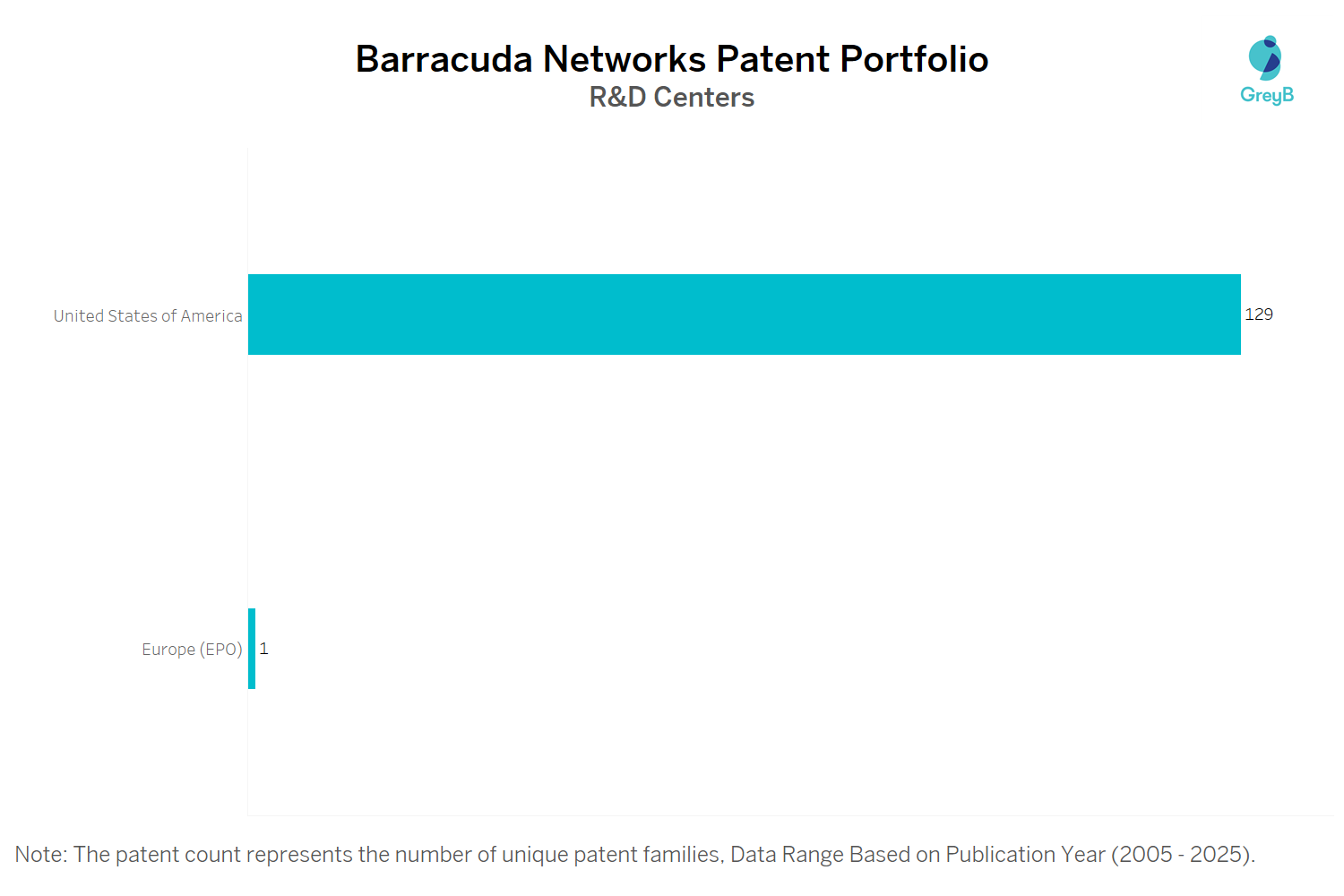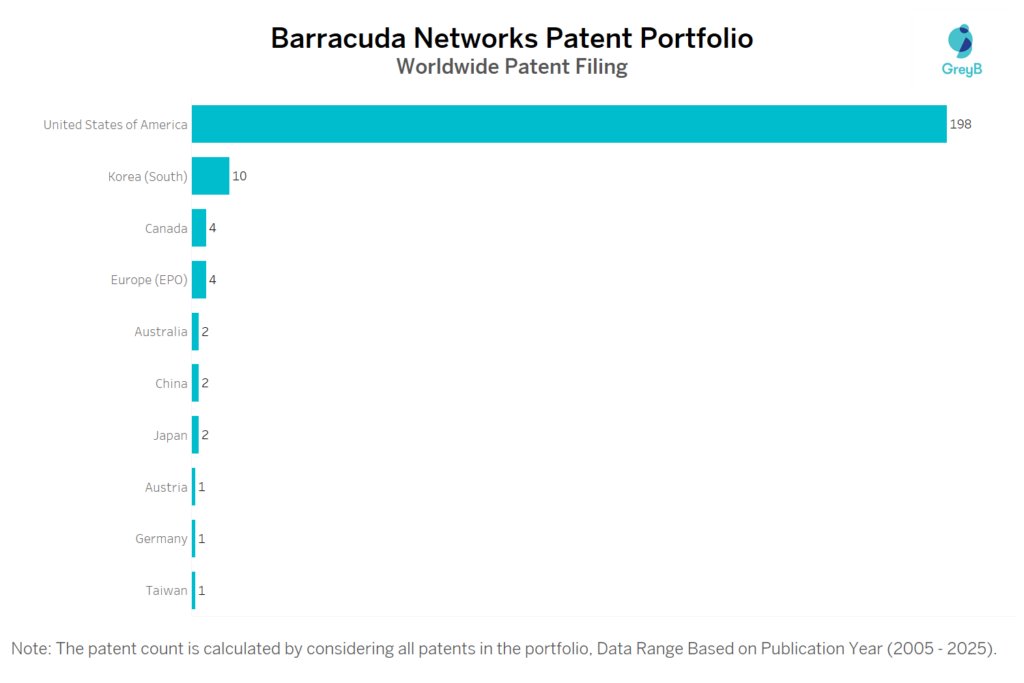Barracuda Networks has a total of 231 patents globally, out of which 122 have been granted. Of these 231 patents, more than 51% patents are active. United States of America is where Barracuda Networks has filed the maximum number of patents, followed by Korea (South) and Europe (EPO). Parallelly, United States of America seems to be the main focused R&D centre and also is the origin country of Barracuda Networks.
