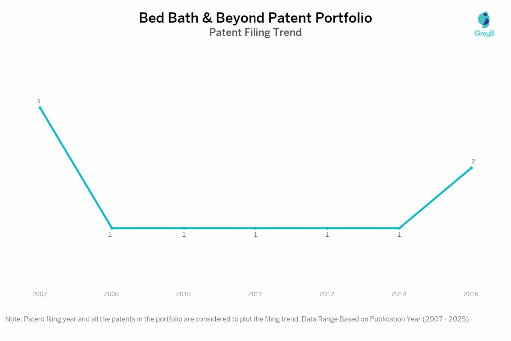 Bed Bath & Beyond has a total of 10 patents globally. These patents belong to none pf the unique patent families. Out of 10 patents, no patents are active.