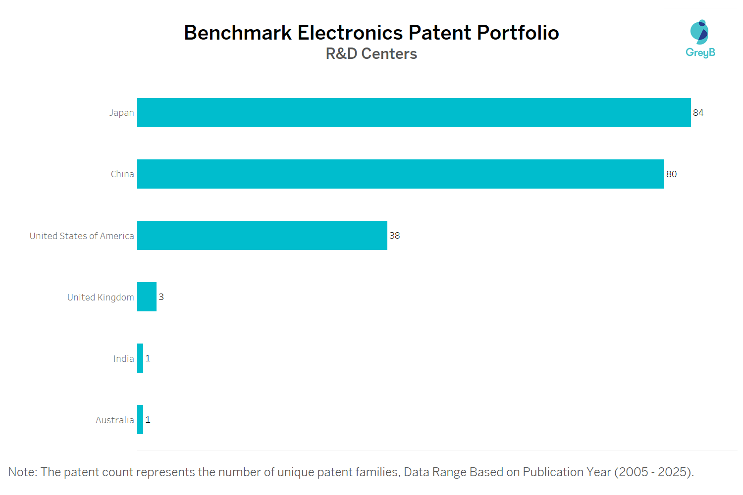 Benchmark Electronics has a total of 278 patents globally, out of which 181 have been granted. Of these 278 patents, more than 49% patents are active. Japan is where Benchmark Electronics has filed the maximum number of patents, followed by China and United States of America. Parallelly, Japan seems to be the main focused R&D centre and also United States of America is the origin country of Benchmark Electronics.