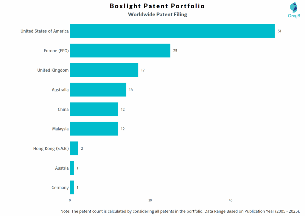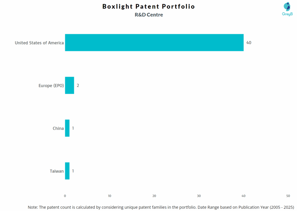 Boxlight has a total of 139 patents globally, out of which 107 have been granted. Of these 139 patents, more than 10% patents are active. United States of America is where Boxlight has filed the maximum number of patents, followed by Europe (EPO) and United Kingdom. Parallelly, United States of America seems to be the main focused R&D centre and also is the origin country of Boxlight.