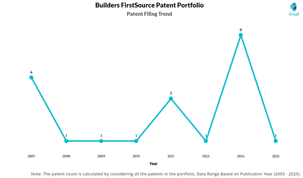 Builders FirstSource (Excluding its subsidiaries) has filed 17 patent applications at USPTO so far (Excluding Design and PCT applications). Out of these 15 have been granted, leading to a grant rate of 100%.
