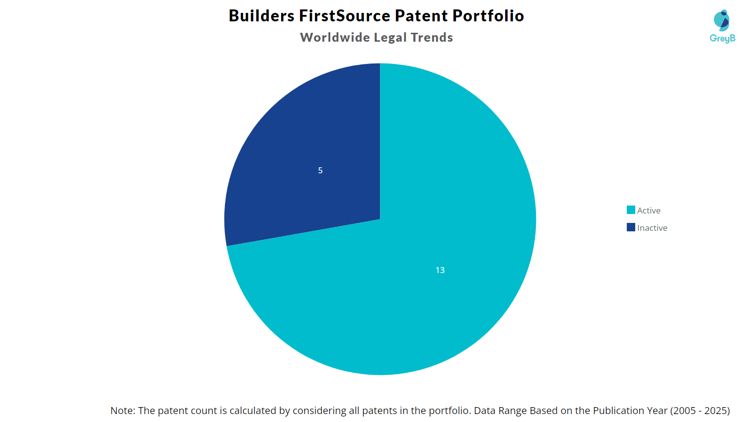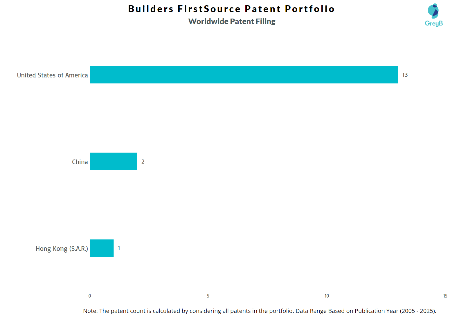 Builders FirstSource has a total of 18 patents globally, out of which 8 have been granted. Of these 18 patents, more than 72% patents are active. The United States of America is where Builders FirstSource has filed the maximum number of patents, followed by China and Hong Kong (S.A.R.). Parallelly, United States of America seems to be the main focused R&D centre and also is the origin country of Builders FirstSource.