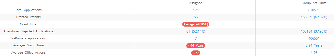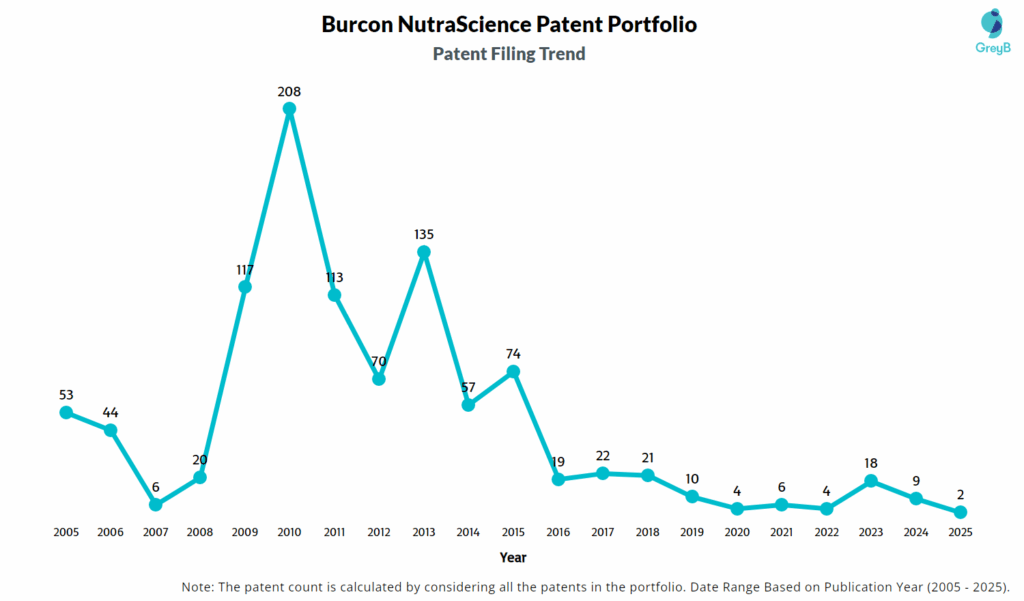 Burcon NutraScience (Excluding its subsidiaries) has filed 124 patent applications at USPTO so far (Excluding Design and PCT applications). Out of these 56 have been granted leading to a grant rate of 47.86%.
