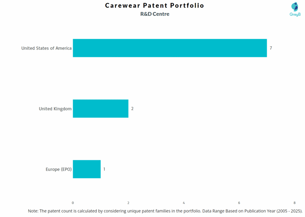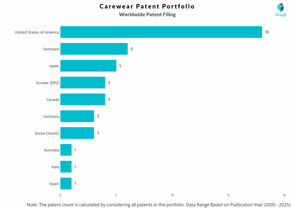 Carewear has a total of 47 patents globally, out of which 44 have been granted. Of these 47 patents, more than 77% patents are active. United States of America is where Carewear has filed the maximum number of patents, followed by Denmark and Japan. Parallelly, USA seems to be the main focused R&D centre and also is the origin country of Carewear.