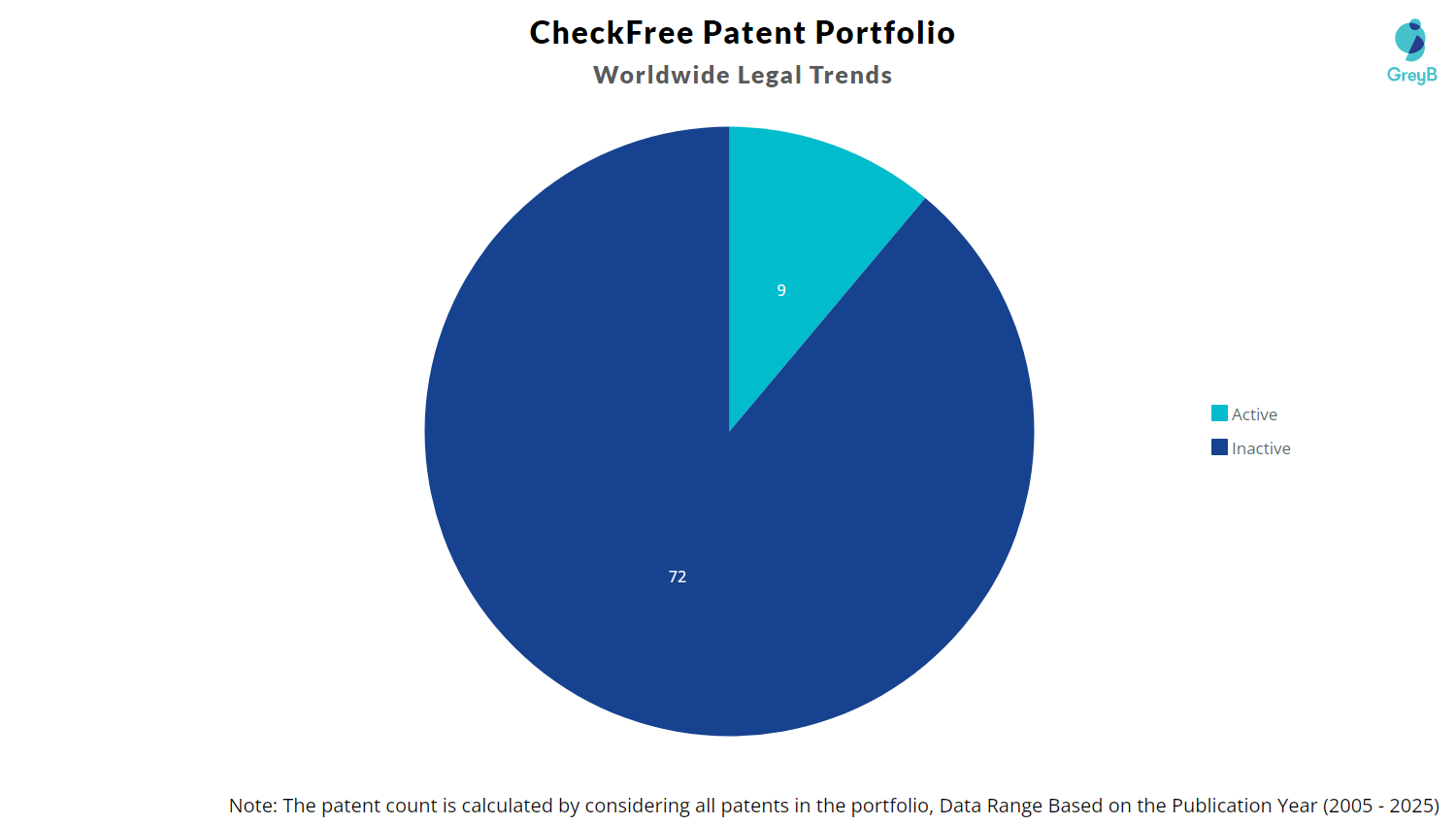 CheckFree has a total of 81 patents globally. These patents belong to 42 unique patent families. Out of 81 patents, 9 patents are active.
