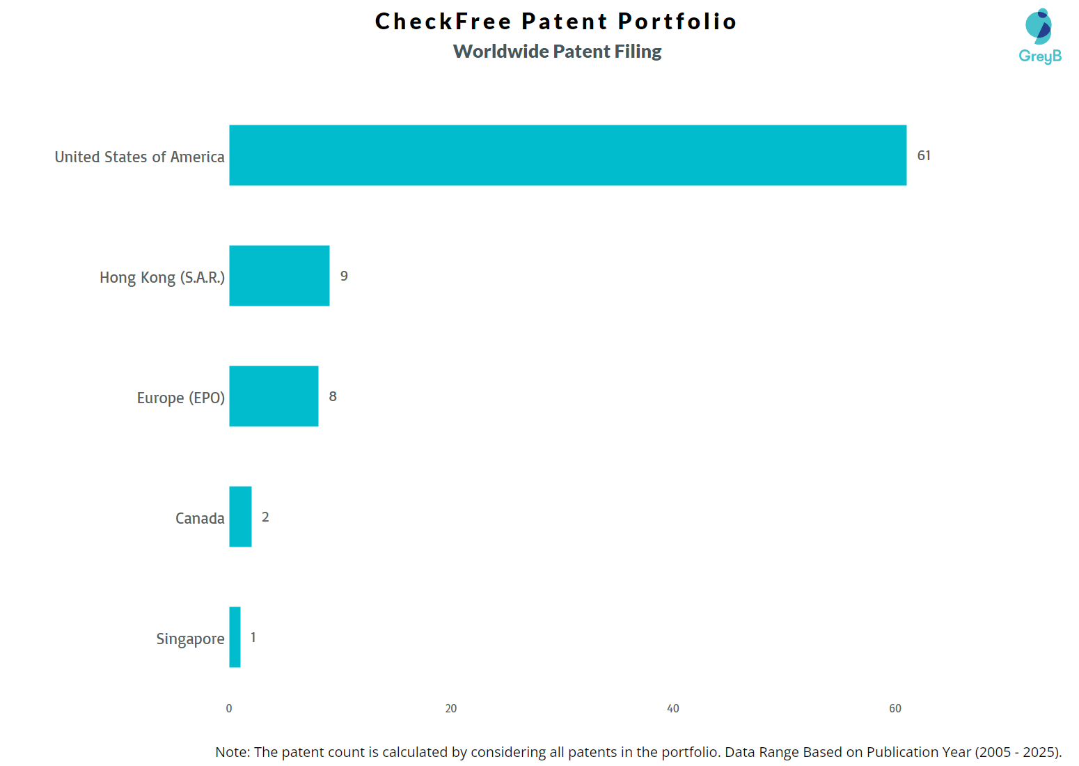 CheckFree has a total of 81 patents globally, out of which 36 have been granted. Of these 81 patents, more than 12% patents are active. The United States of America is where CheckFree has filed the maximum number of patents, followed by Hong Kong (S.A.R.) and Europe (EPO). Parallelly, United States of America seems to be the main focused R&D centre and also is the origin country of CheckFree.