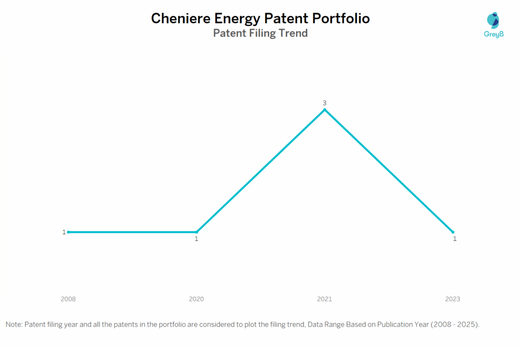 Cheniere Energy has a total of 6 patents globally. These patents belong to 2 unique patent families. Out of 6 patents, all patents are active.