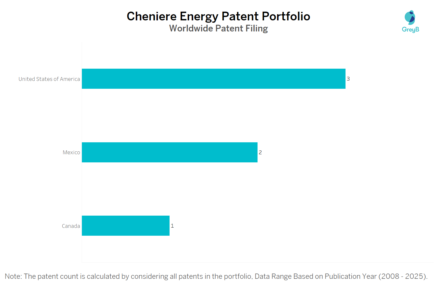 Cheniere Energy has a total of 6 patents globally, out of which 3 have been granted. Of these 6 patents, all patents are active. United States of America is where Cheniere Energy has filed the maximum number of patents. Parallelly, United States of America seems to be the main focused R&D centre and also is the origin country of Cheniere Energy.