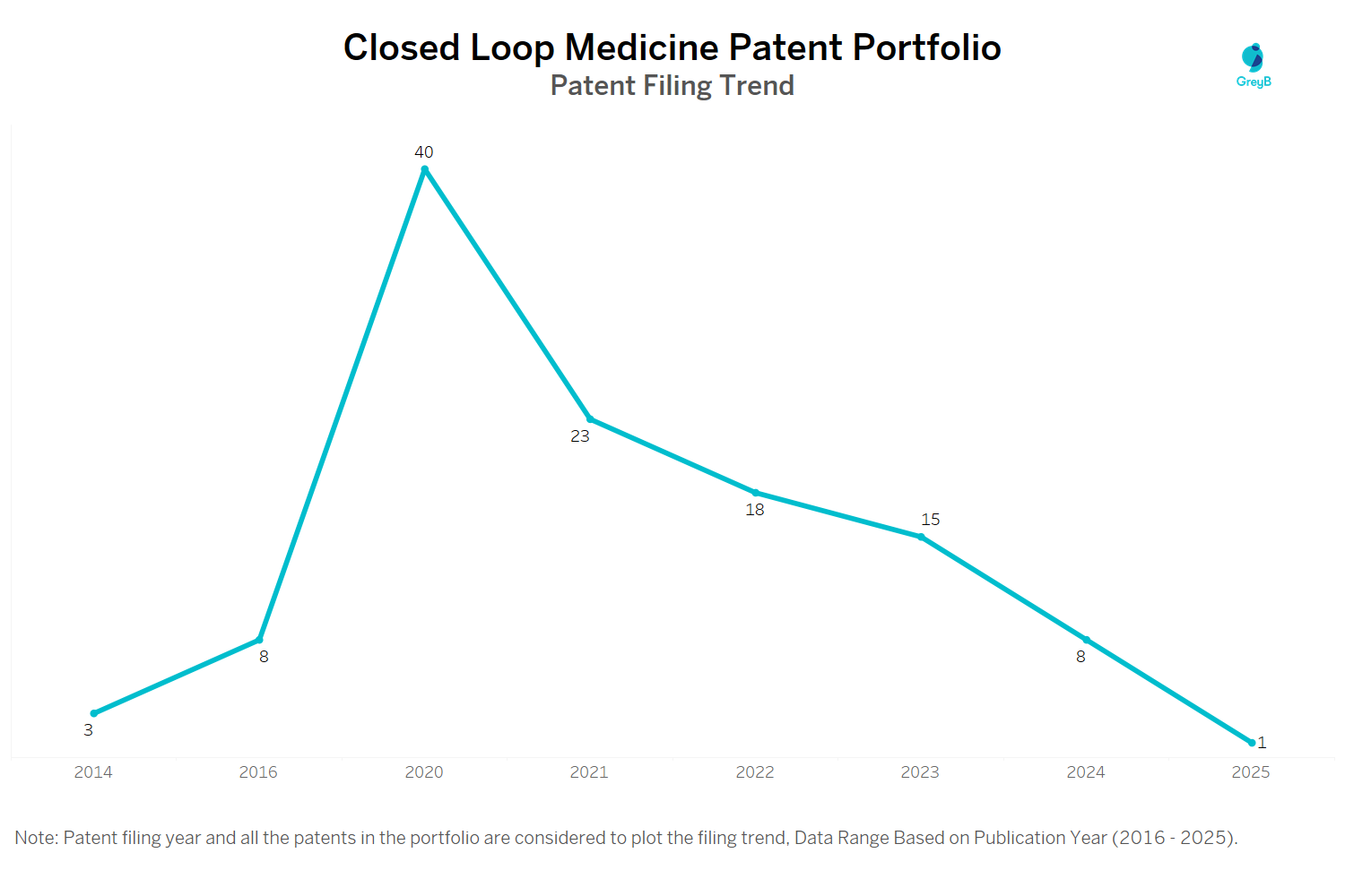 Closed Loop Medicine has a total of 116 patents globally, out of which 36 have been granted. Of these 116 patents, 71% patents are active. The United States of America is where Closed Loop Medicine has filed the maximum number of patents, followed by Europe (EPO) and United Kingdom. Parallelly, the United States of America seems to be the main focused R&D centre while United Kingdom is the origin country of Closed Loop Medicine.