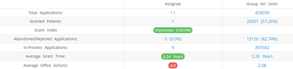 Closed Loop Medicine (Excluding its subsidiaries) has filed 11 patent applications at USPTO so far (Excluding Design and PCT applications). Out of these 1 has been granted leading to a grant rate of 100%.