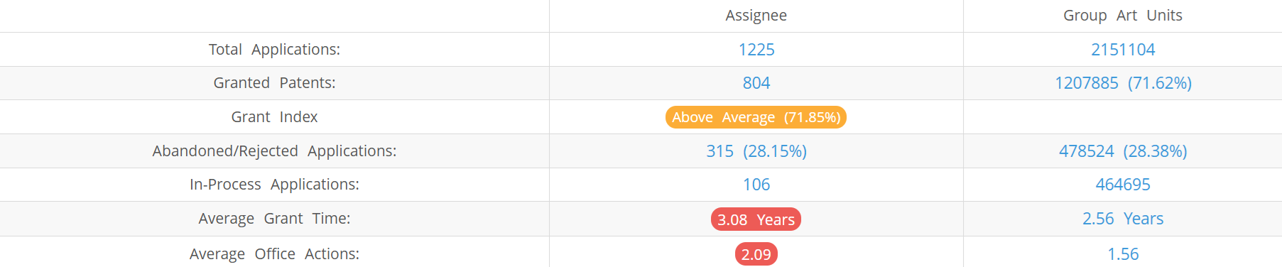 Coca Cola (Excluding its subsidiaries) has filed 1225 patent applications at USPTO so far (Excluding Design and PCT applications). Out of these 804 have been granted leading to a grant rate of 71.85%.