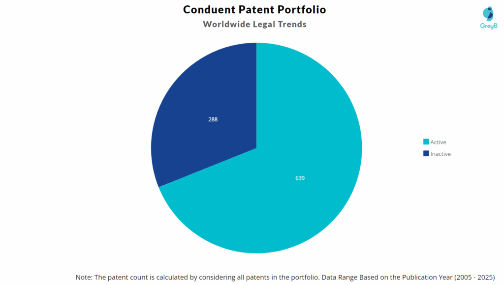 Conduent has a total of 927 patents globally. These patents belong to 632 unique patent families. Out of 927 patents, 639 patents are active.