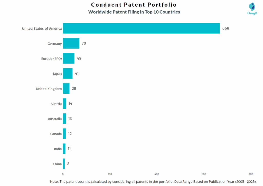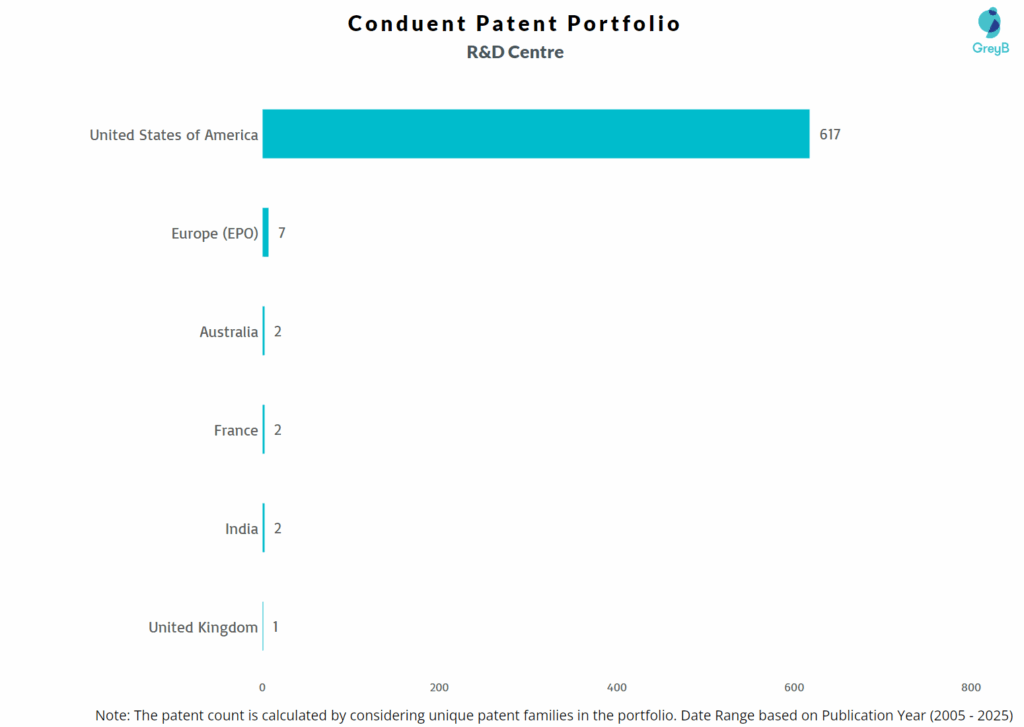 Conduent has a total of 927 patents globally, out of which 698 have been granted. Of these 927 patents, more than 69% patents are active. United States of America is where Conduent has filed the maximum number of patents, followed by Germany and Europe (EPO). Parallelly, United States of America seems to be the main focused R&D centre and also is the origin country of Conduent.