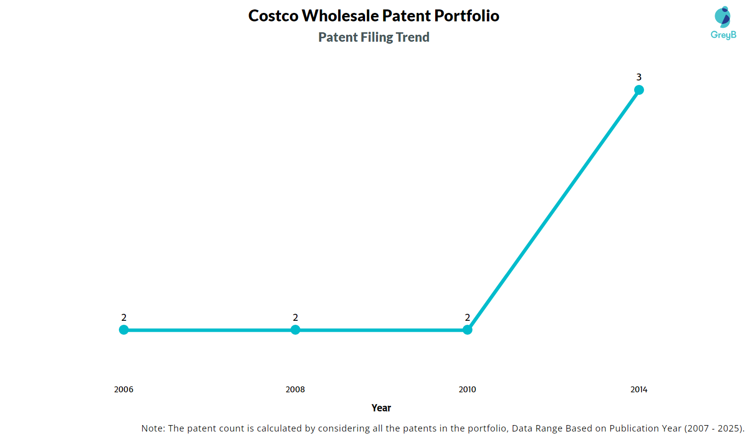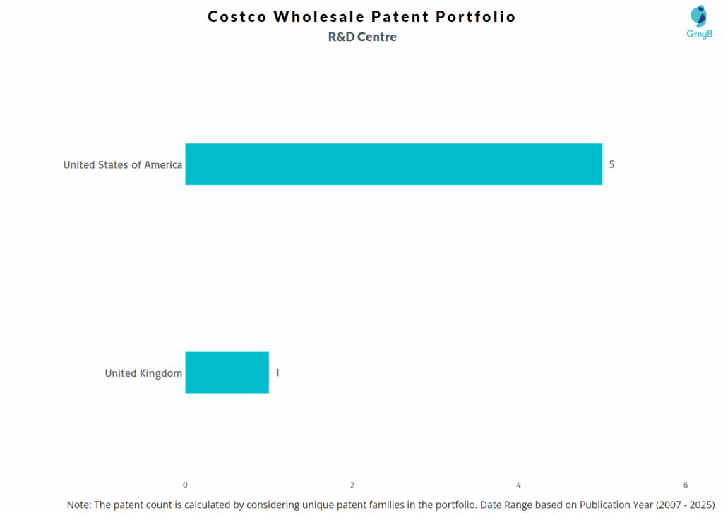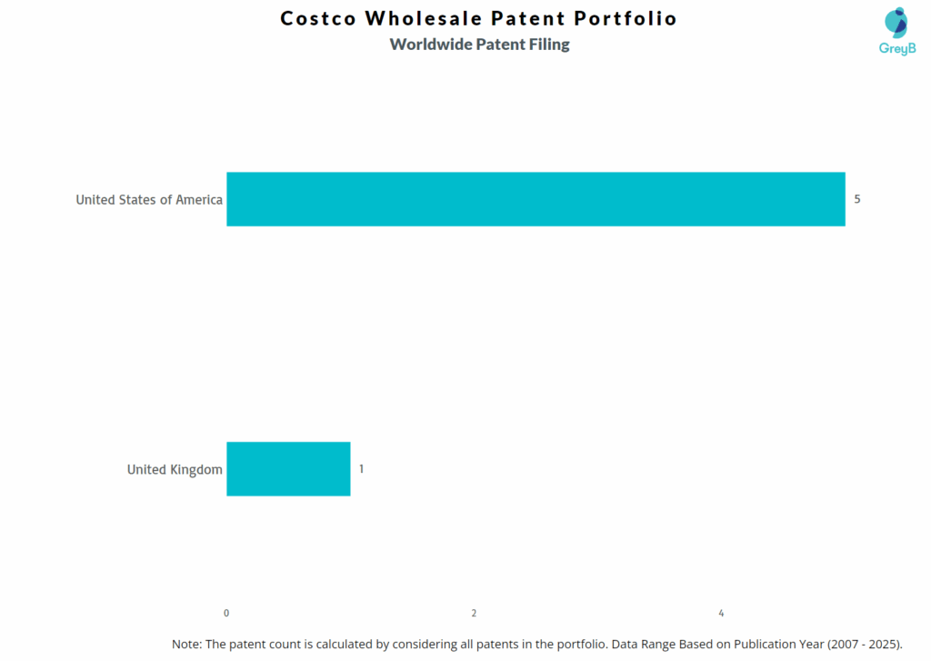 Costco Wholesale has a total of 9 patents globally, out of which 5 have been granted. Of these 9 patents, more than 44% patents are active. United States of America is where Costco Wholesale has filed the maximum number of patents, followed by United Kingdom. Parallelly, United States of America seems to be the main focused R&D centre and also is the origin country of Costco Wholesale.