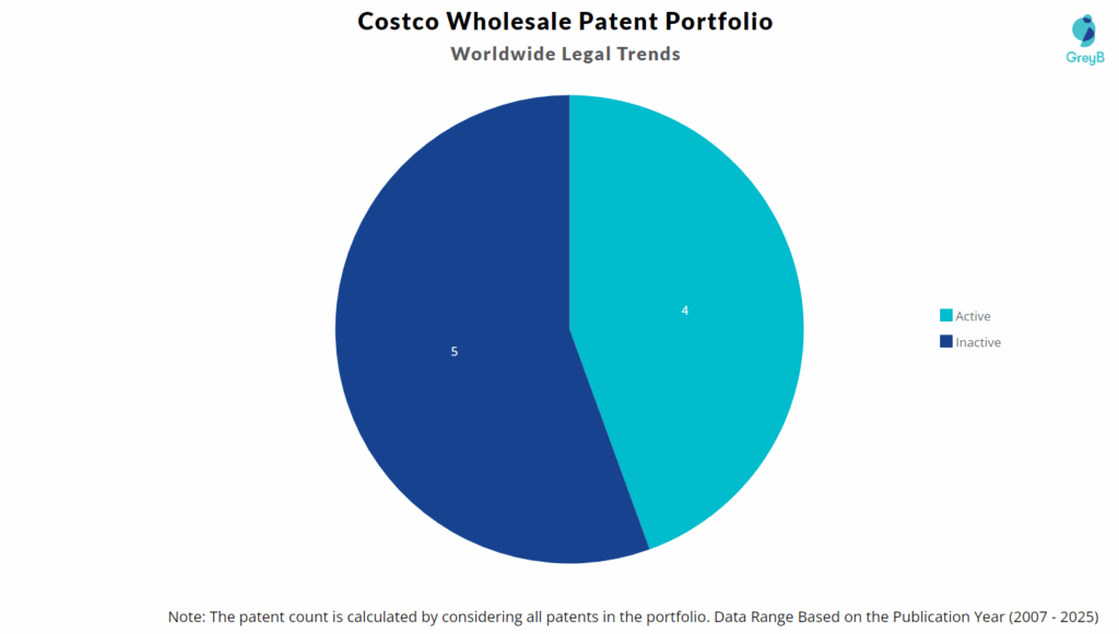 Costco Wholesale has a total of 9 patents globally. These patents belong to none of the unique patent families. Out of 9 patents, 4 patents are active.