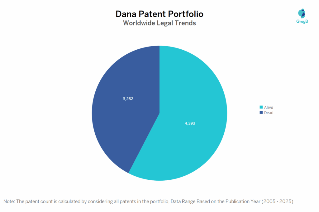 Dana has a total of 7625 patents globally. These patents belong to 3395 unique patent families. Out of 7625 patents, 4393 patents are active.