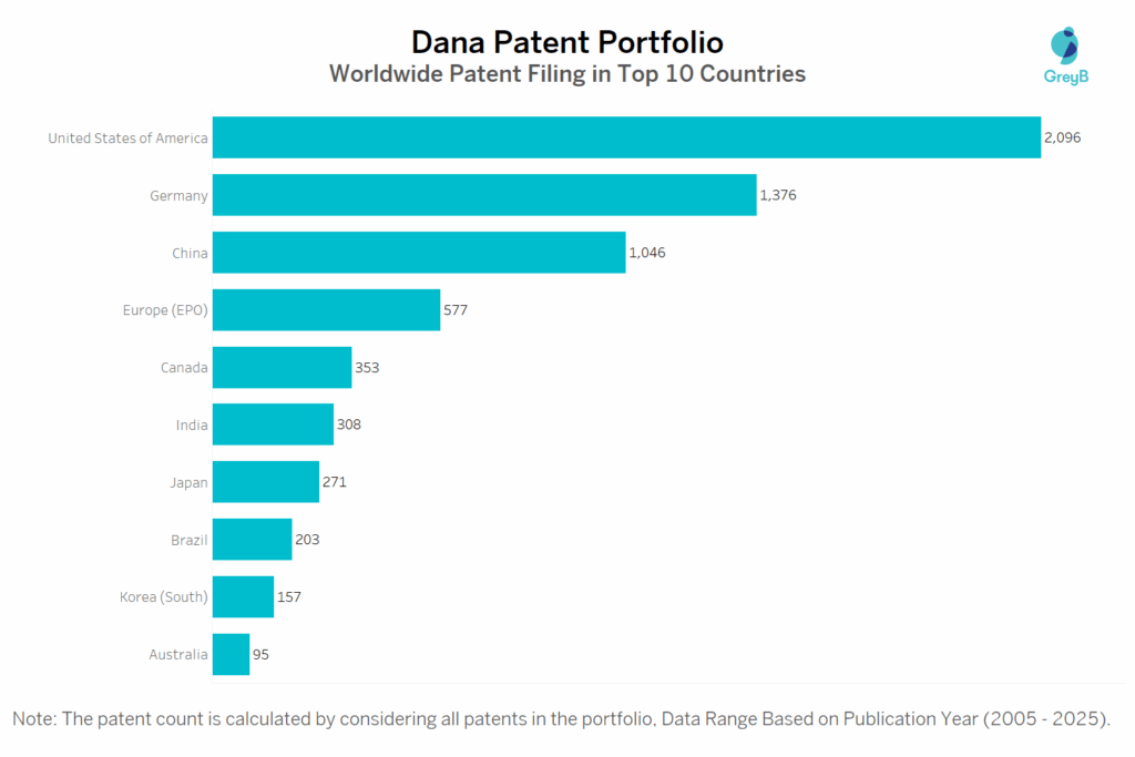 Dana has a total of 7625 patents globally, out of which 3896 have been granted. Of these 7625 patents, more than 57% patents are active. United States of America is where Dana has filed the maximum number of patents, followed by Germany and China. Parallelly, United States of America seems to be the main focused R&D centre and also is the origin country of Dana.