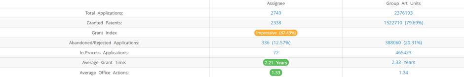 Dana (Excluding its subsidiaries) has filed 2749 patent applications at USPTO so far (Excluding Design and PCT applications). Out of these 2338 have been granted leading to a grant rate of 87.43%.