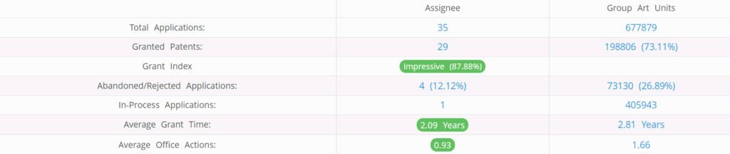 Danby Products (Excluding its subsidiaries) has filed 35 patent applications at USPTO so far (Excluding Design and PCT applications). Out of these 29 have been granted leading to a grant rate of 87.88%.