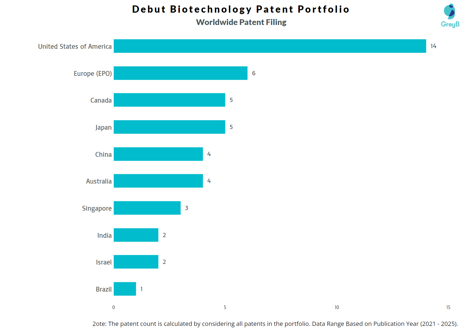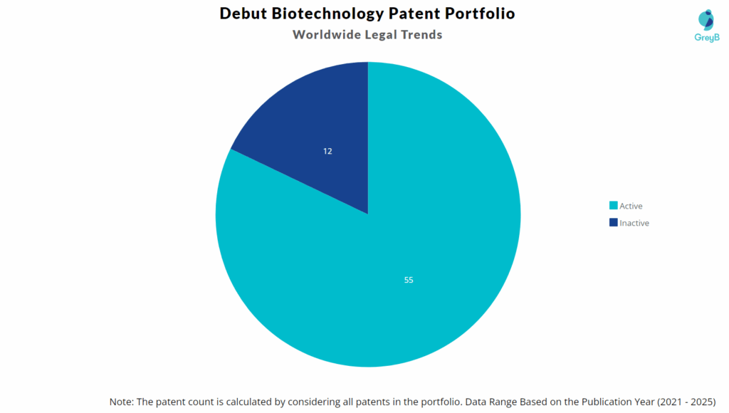 Debut Biotechnology has a total of 67 patents globally, out of which 3 have been granted. Of these 67 patents, more than 82% patents are active. The United States of America is where Debut Biotechnology has filed the maximum number of patents, followed by Europe (EPO). Parallelly, United States of America seems to be the main focused R&D centre and also is the origin country of Debut Biotechnology.