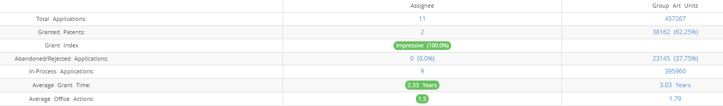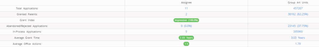Debut Biotechnology (Excluding its subsidiaries) has filed 11 patent applications at USPTO so far (Excluding Design and PCT applications). Out of these 2 have been granted leading to a grant rate of 100%.