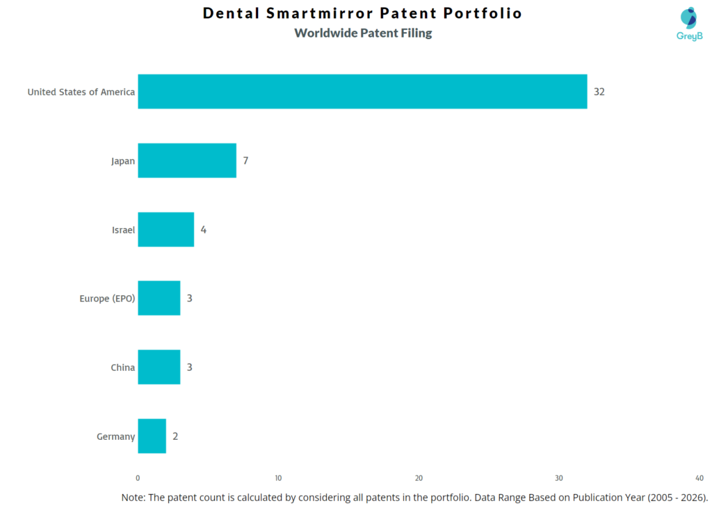 Dental Smartmirror has a total of 56 patents globally, out of which 35 have been granted. Of these 56 patents, 80% patents are active. The United States of America is where Dental Smartmirror has filed the maximum number of patents, followed by Japan and Israel. Parallelly, the United States of America seems to be the main focused R&D centre and is the origin country of Dental Smartmirror.