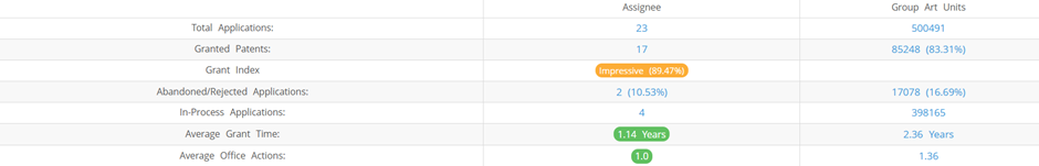 Dental Smartmirror (Excluding its subsidiaries) has filed 23 patent applications at USPTO so far (Excluding Design and PCT applications). Out of these 17 has been granted leading to a grant rate of 89.47%.