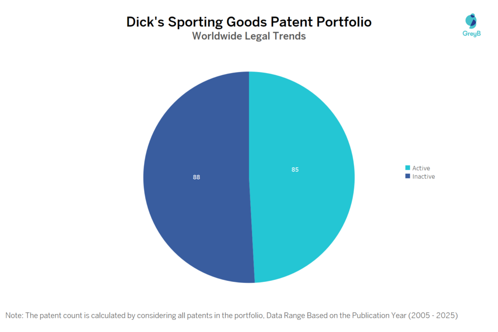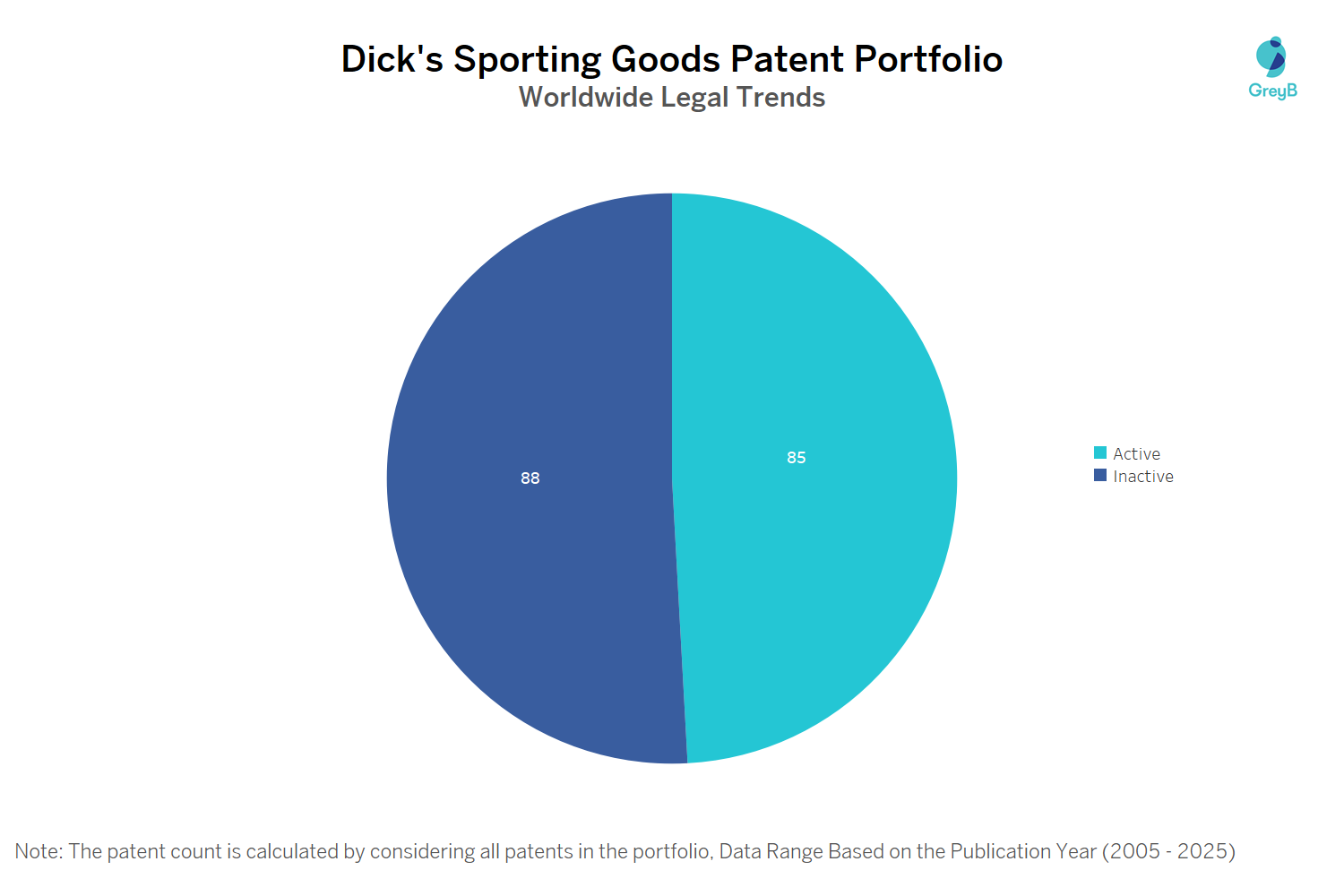 Dick’s Sporting Goods has a total of 173 patents globally. These patents belong to 82 unique patent families. Out of 173 patents, 85 patents are active.