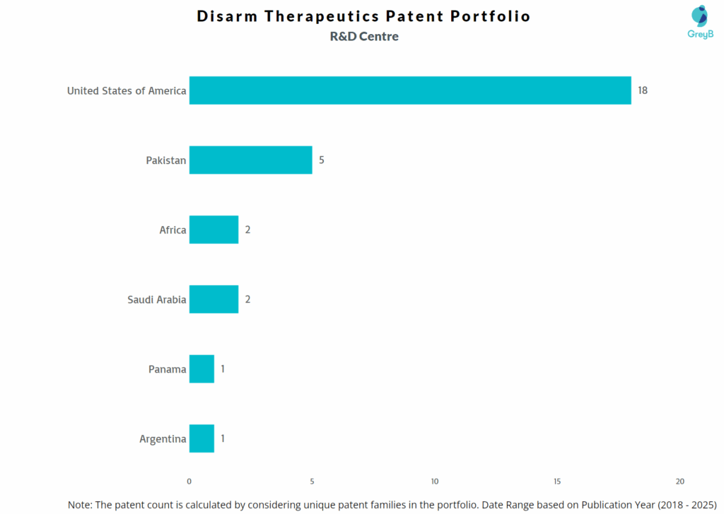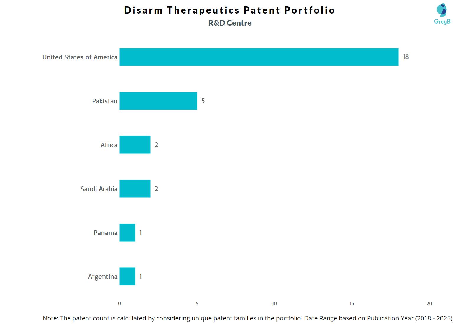 Disarm Therapeutics has a total of 181 patents globally. These patents belong to 29 unique patent families. Out of 181 patents, 157 patents are active.