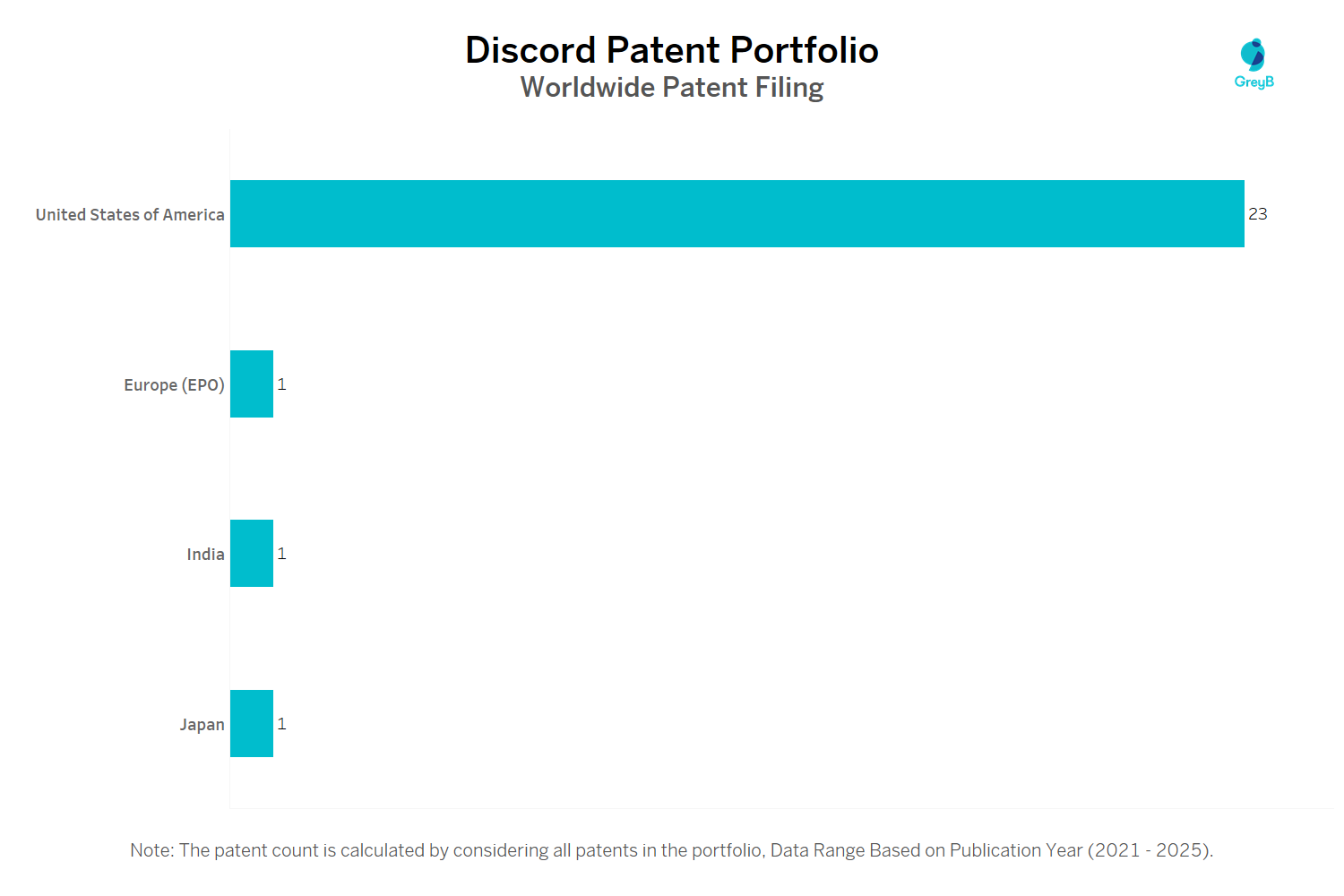 Discord has a total of 28 patents globally, out of which 12 have been granted. Of these 28 patents, 92% patents are active. The United States of America is where Discord has filed the maximum number of patents, followed by Europe (EPO) and Japan. Parallelly, the United States of America seems to be the main focused R&D centre and is the origin country of Discord.