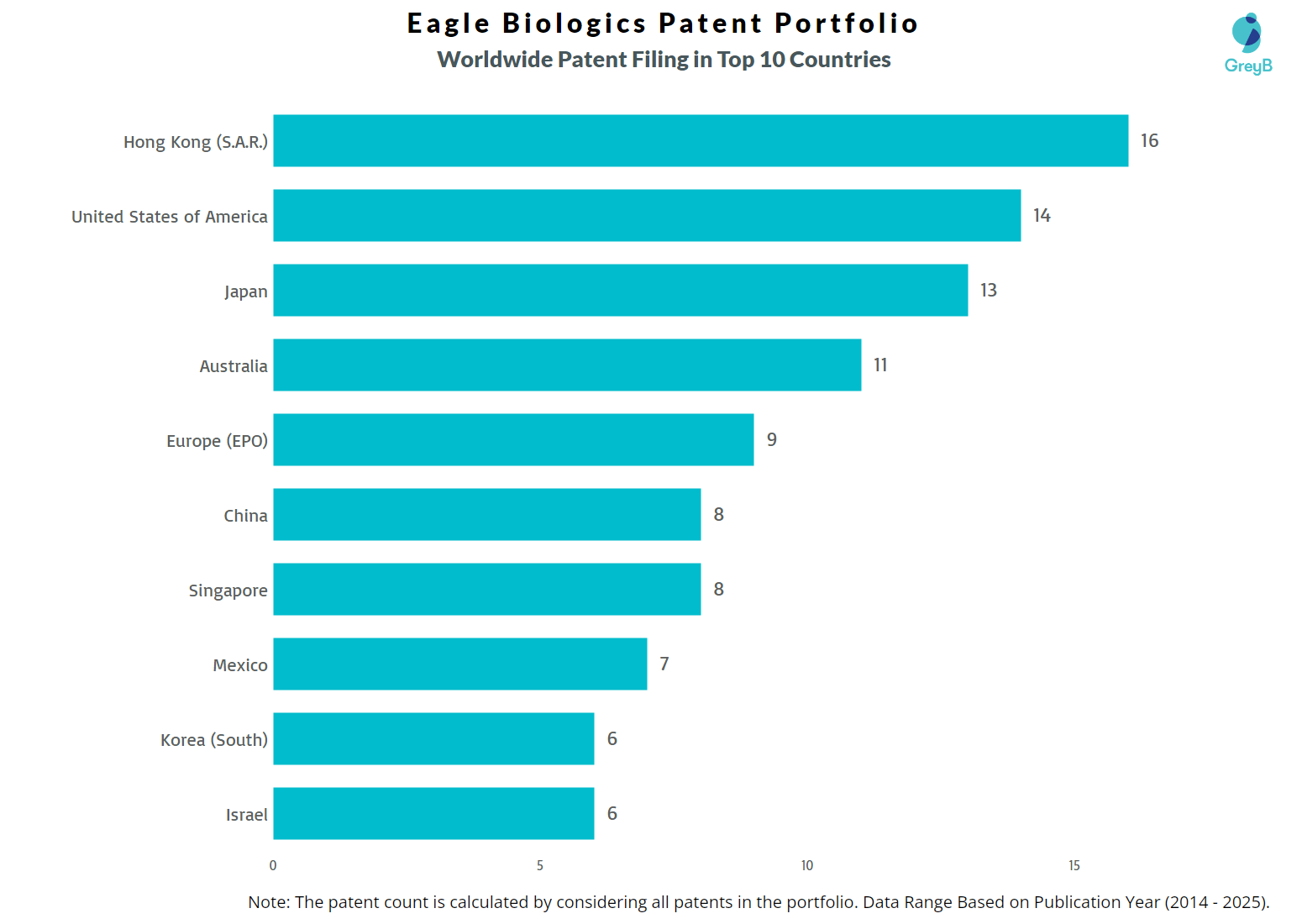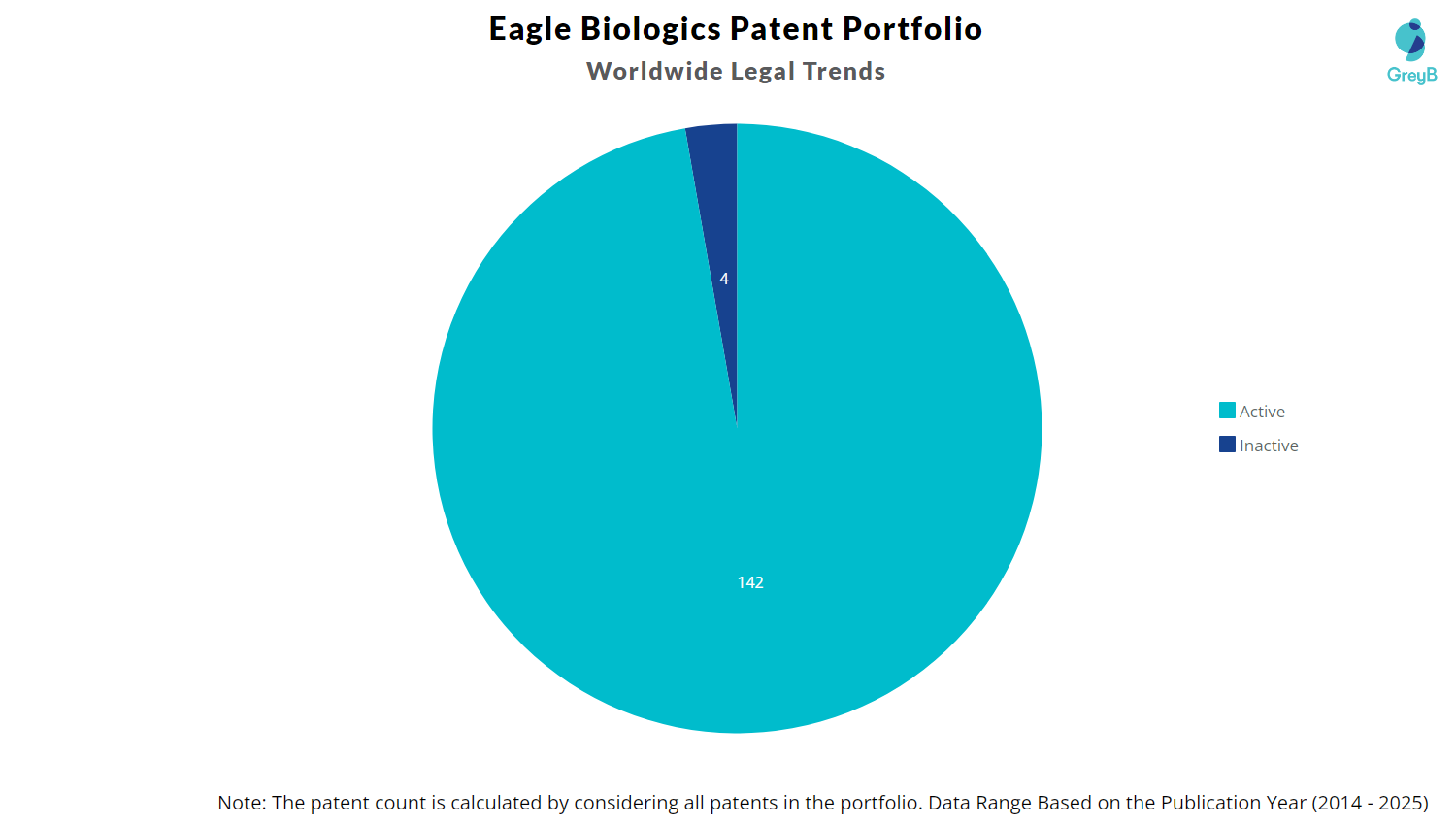 Eagle Biologics has a total of 146 patents globally. These patents belong to 5 unique patent families. Out of 146 patents, 142 patents are active.