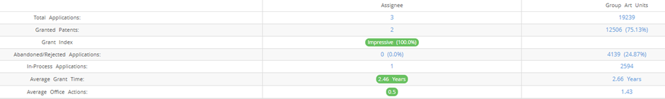 Entoprot (Excluding its subsidiaries) has filed 3 patent applications at USPTO so far (Excluding Design and PCT applications). Out of these 2 have been granted leading to a grant rate of 100%.