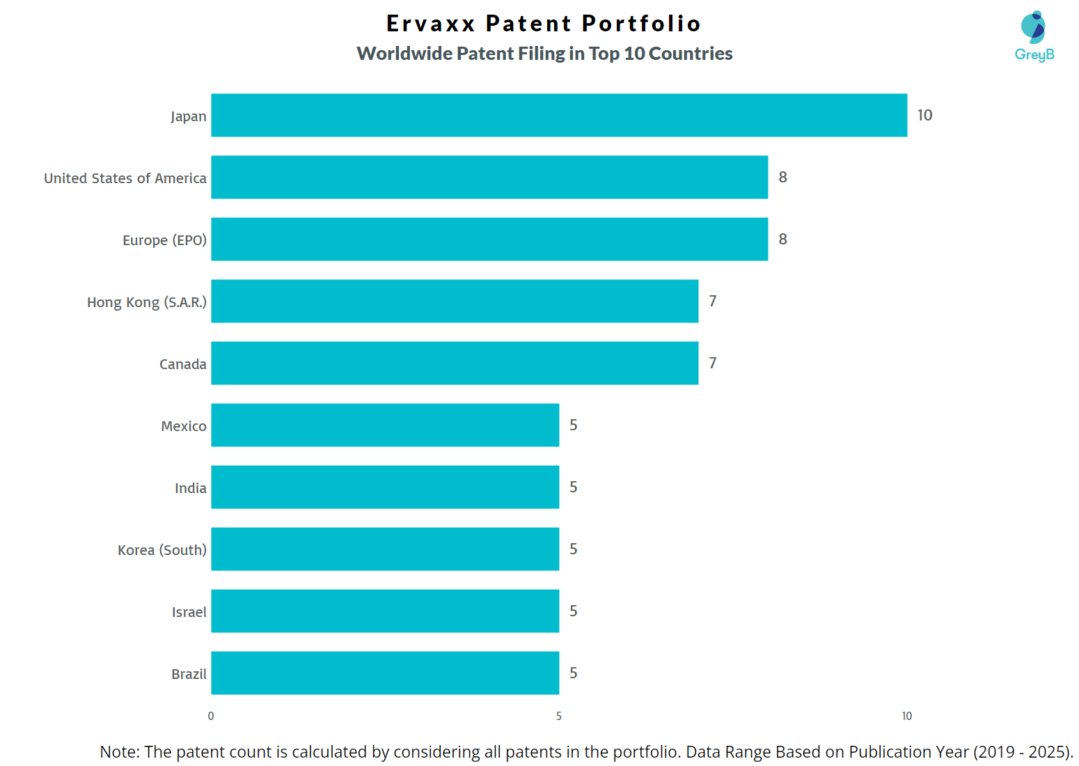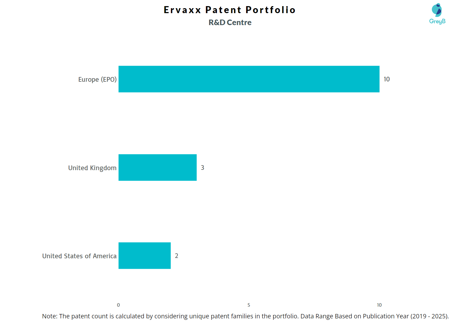 Ervaxx has a total of 97 patents globally, out of which 2 have been granted. Of these 97 patents, more than 72% patents are active. Japan is where Ervaxx has filed the maximum number of patents. Parallelly, Europe (EPO) seems to be the main focused R&D centre and also United Kingdom is the origin country of Ervaxx.