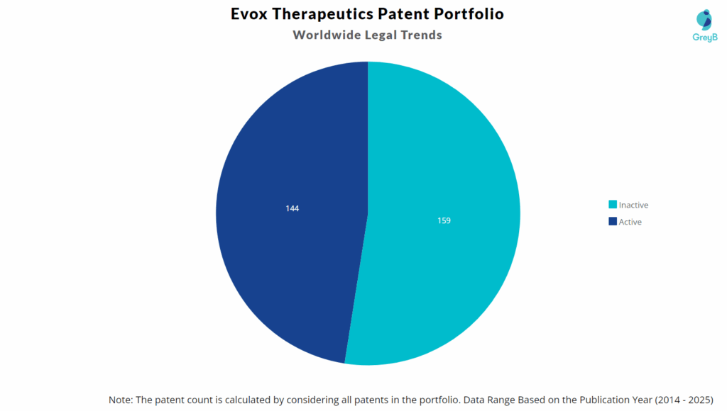Evox Therapeutics has a total of 303 patents globally. These patents belong to 32 unique patent families. Out of 303 patents, 144 patents are active.